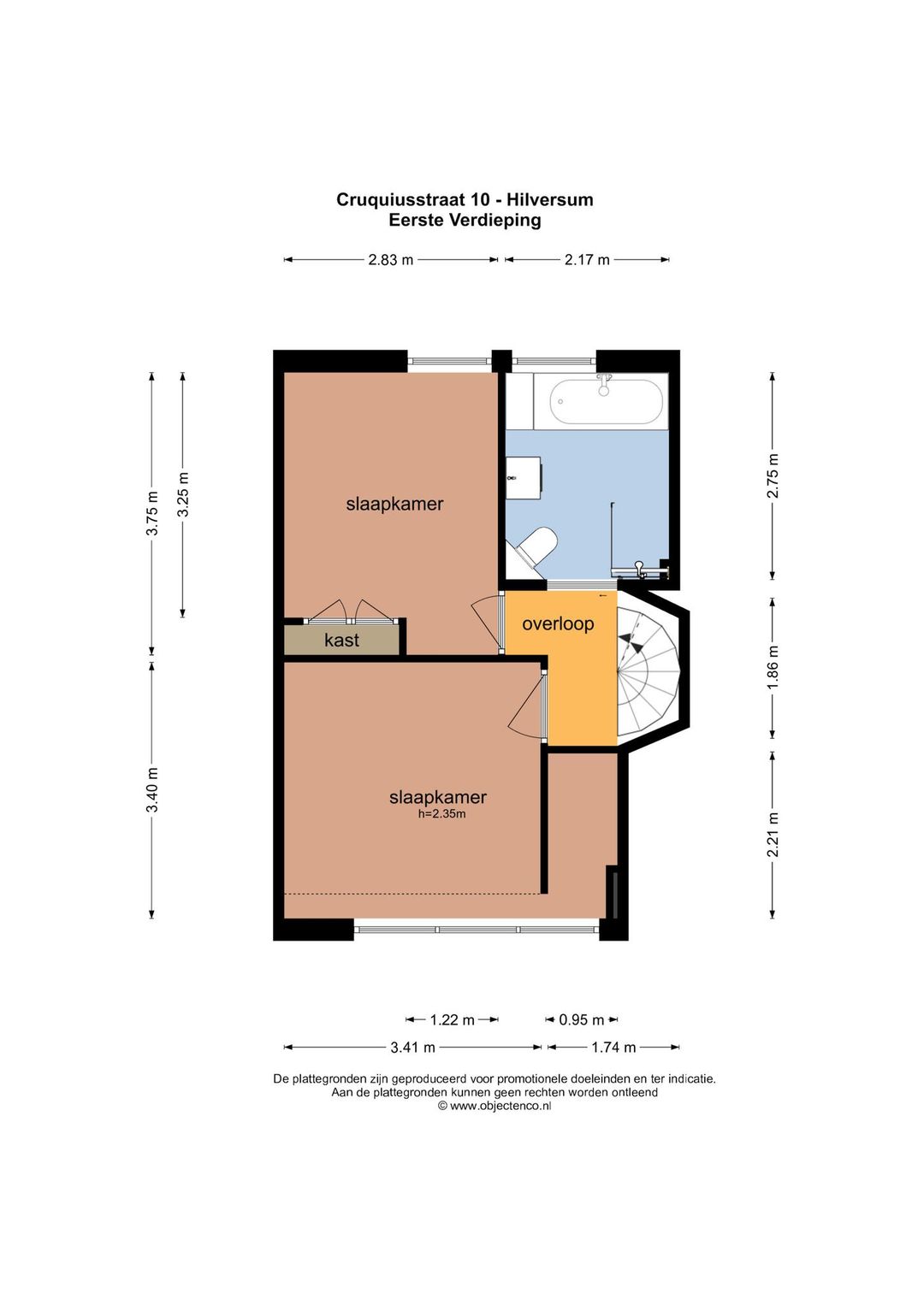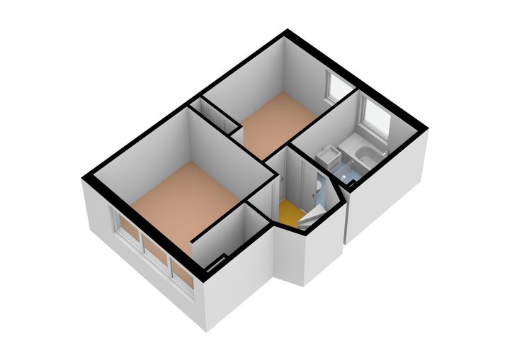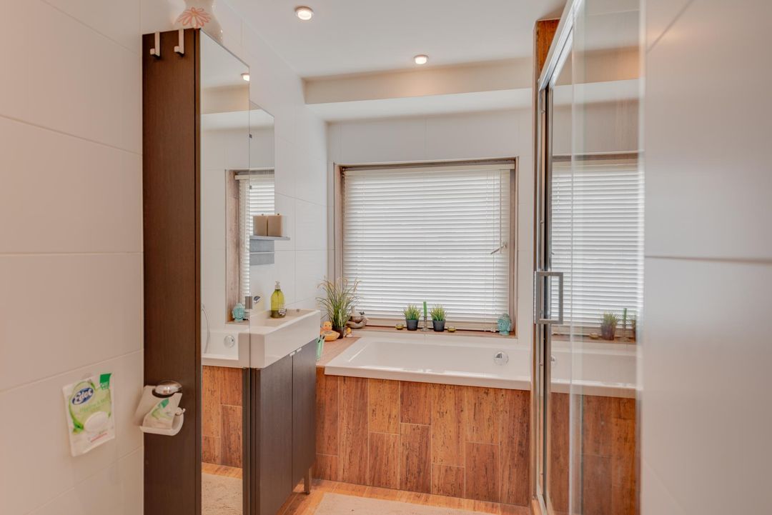Eerste verdieping (via spiltrap vanuit de woonkamer): overloop, complete badkamer met 2e toilet, inloopdouche, ligbad en vaste wastafel, 1e slaapkamer aan de achterzijde met vaste kast, 2e grote slaapkamer aan de voorzijde.