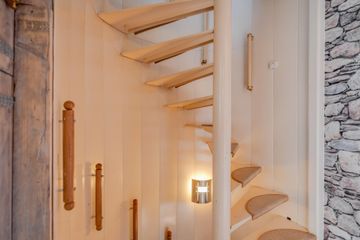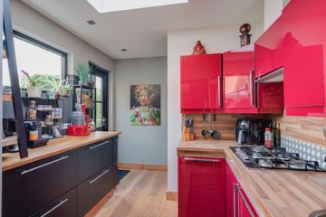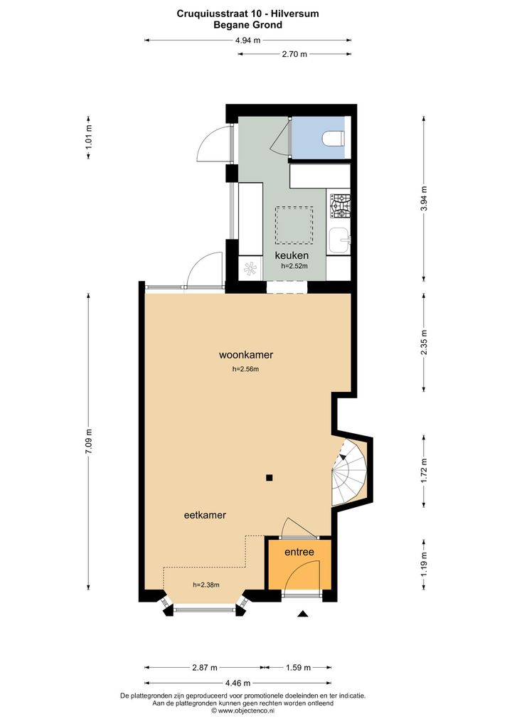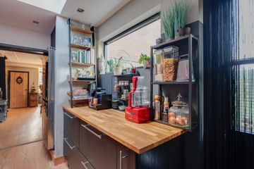 Entree, halletje, royale woon- eetkamer met fraaie houten vloer, moderne keuken met diverse inbouwapparatuur (5 pits kookplaat, afzuigkap, vaatwasser, dubbele combi-oven en amerikaanse koelkast met dispenser), ruim modern toilet. Achter de uitbouw van de keuken bevindt zich een aangebouwde schuur.