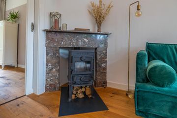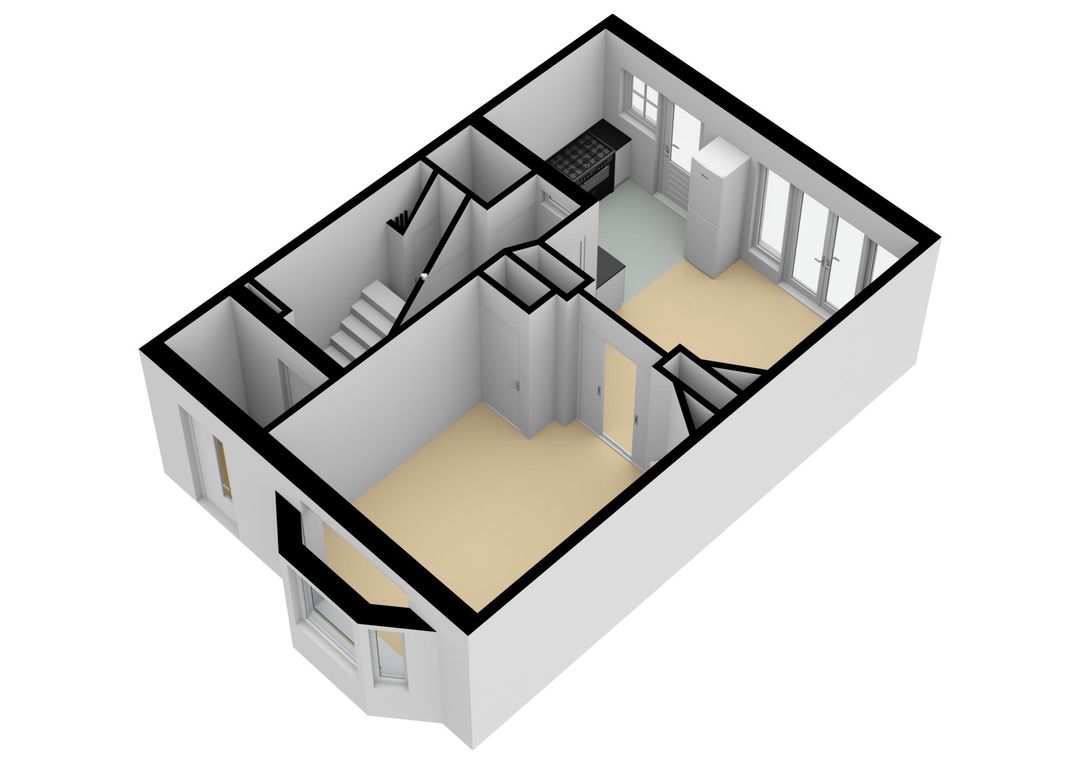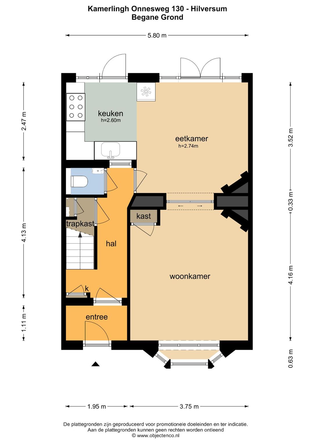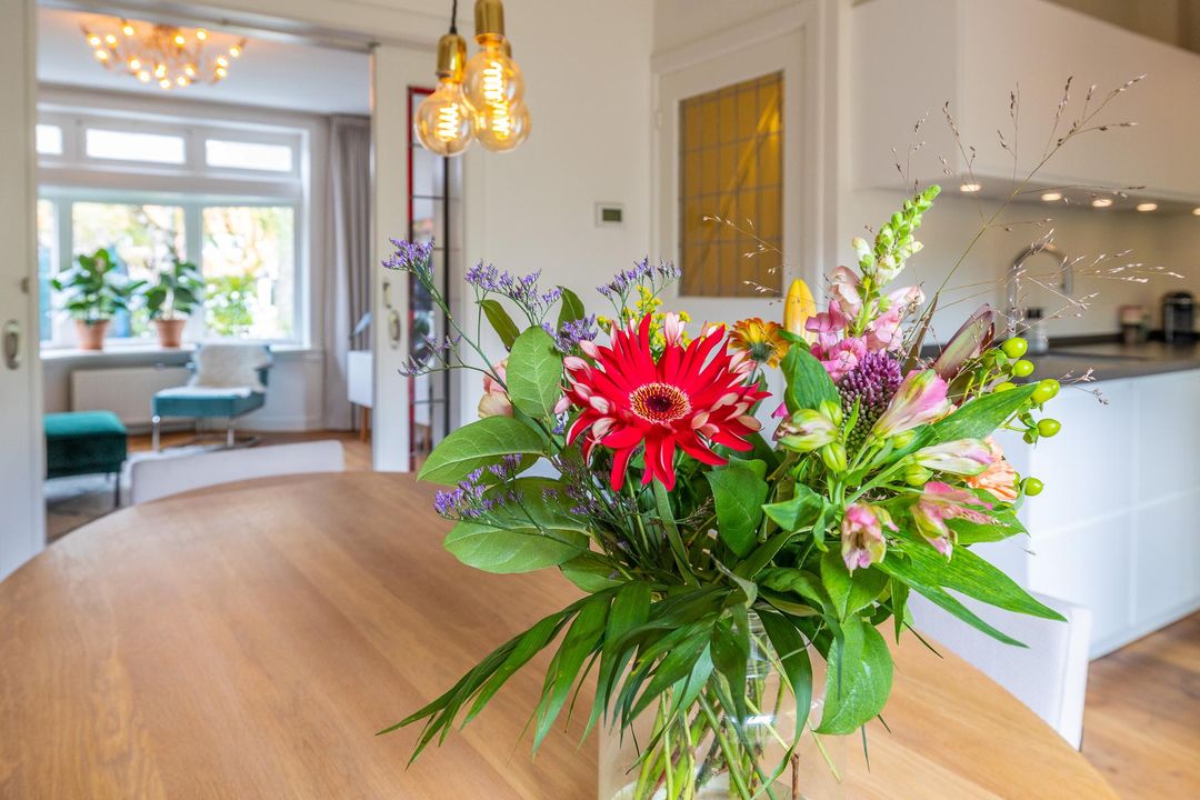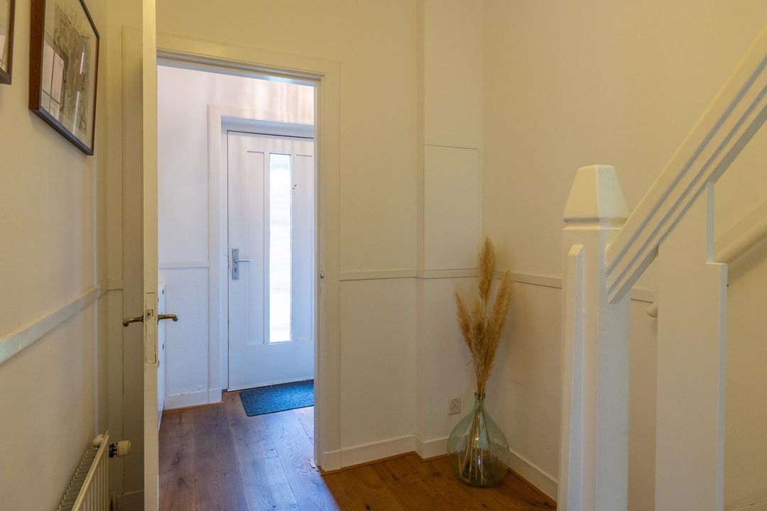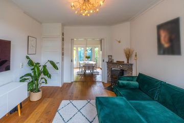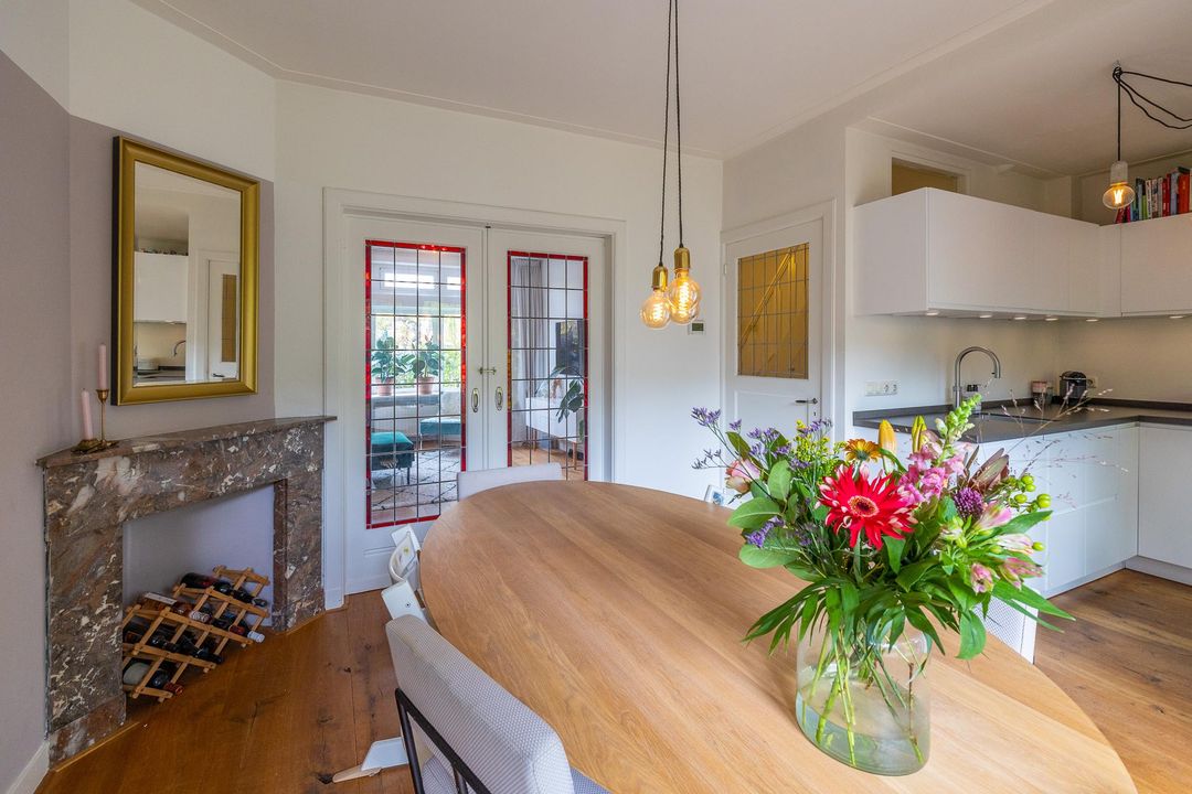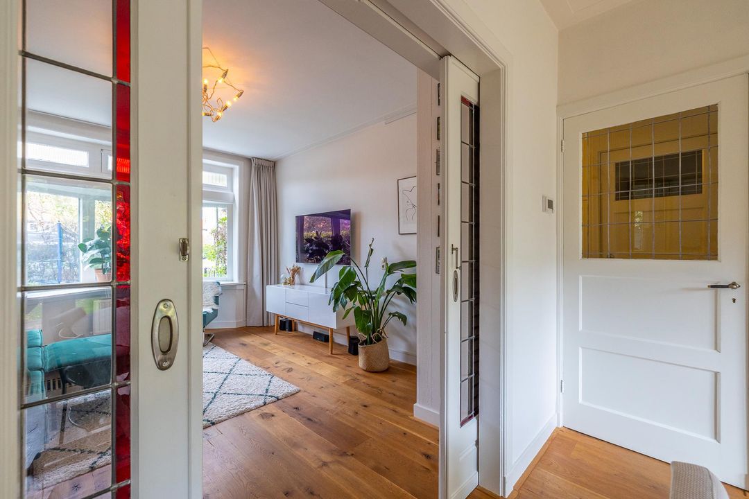 Begane grond: vestibule met tochtdeur voorzien van glas in lood, gang, trapkast, toilet met fontein, woonkamer en suite met schuifdeuren met glas in lood, aan beide zijden van de kamers nog de originele marmeren schouwen, voorkamer met erker, achterkamer met openslaande deuren naar de tuin, moderne open keuken met diverse inbouwapparatuur.