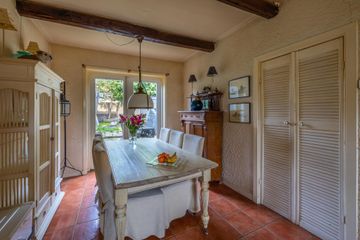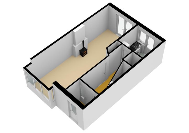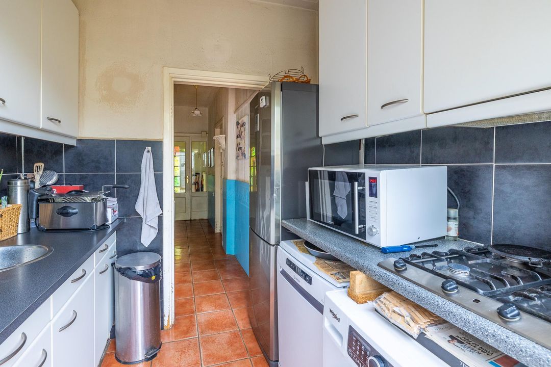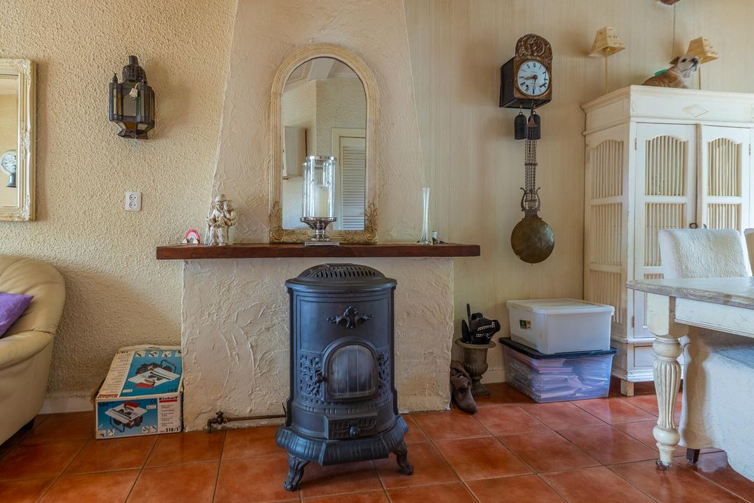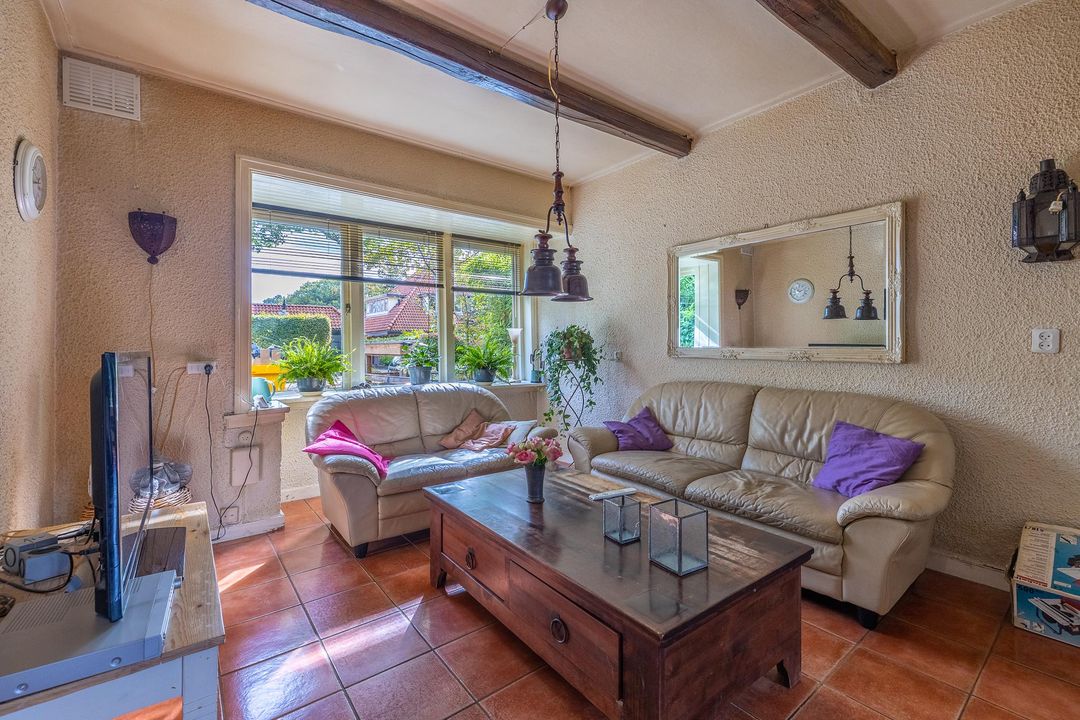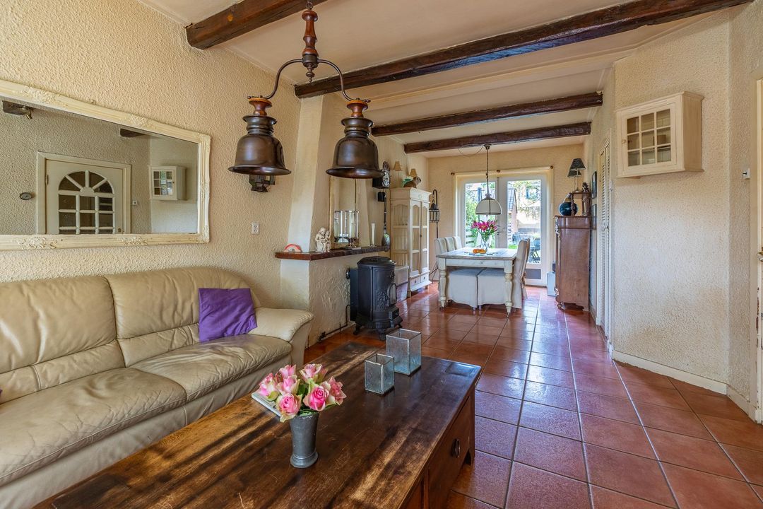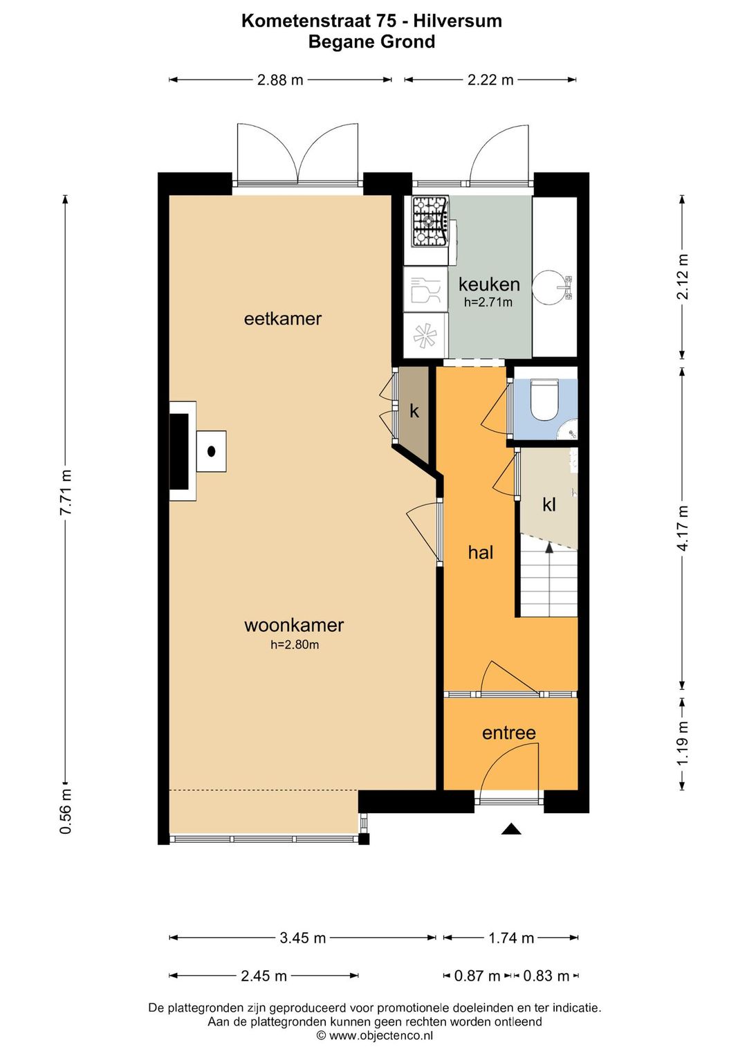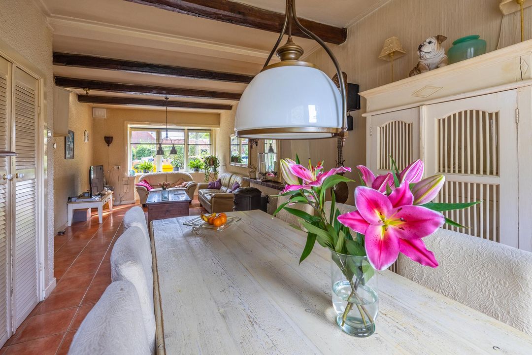 Indeling: entree, tochtportaal, ruime lichte woon-eetkamer met vaste kasten en openslaande deuren naar terras en tuin. Gang naar de keuken met toilet en trapkast, Eenvoudige keuken.