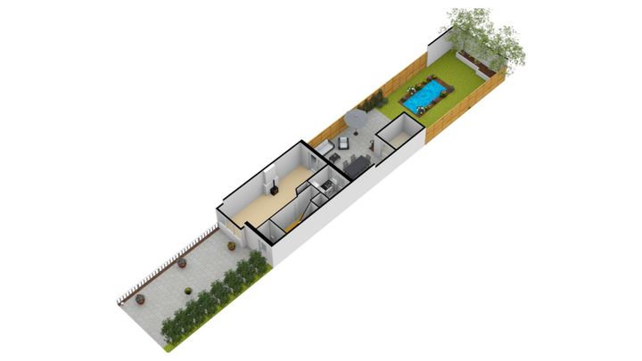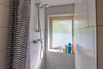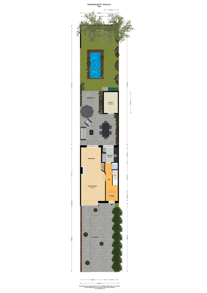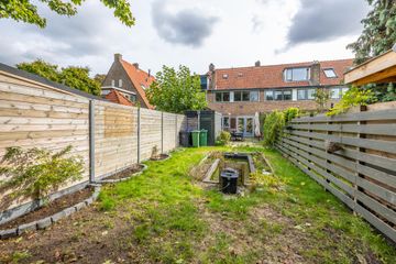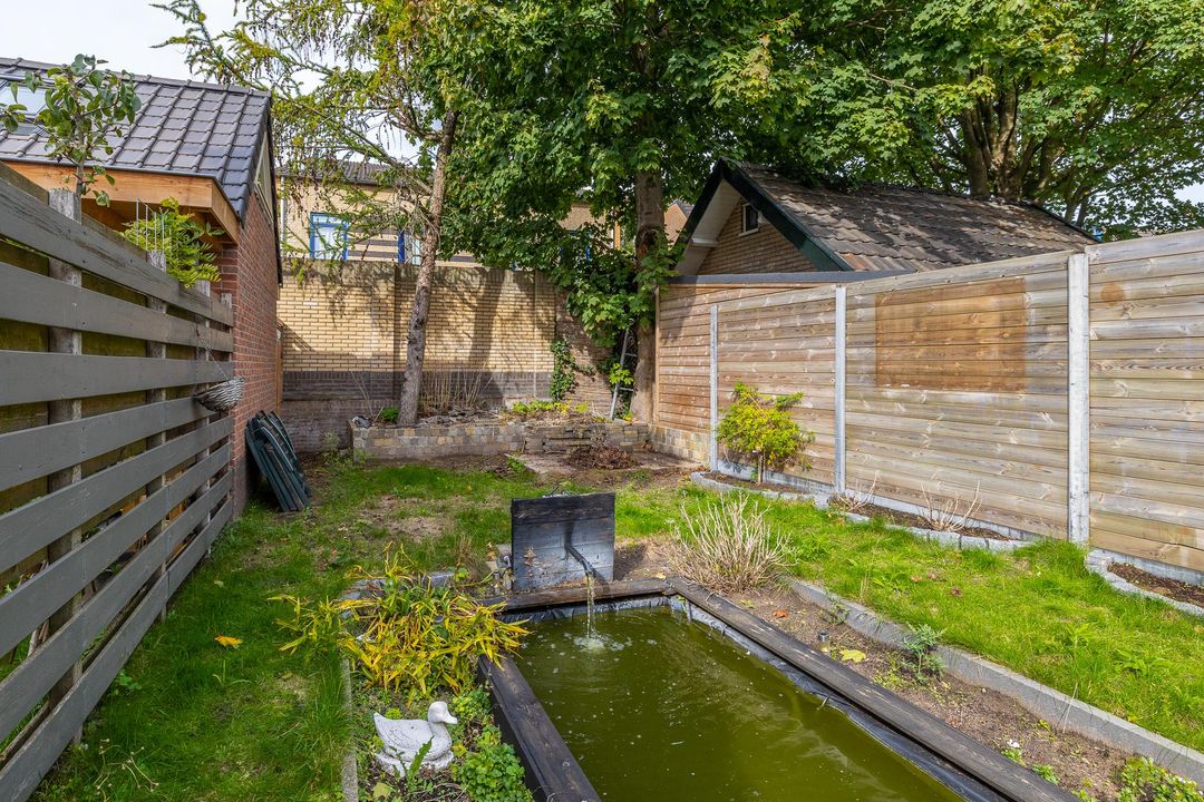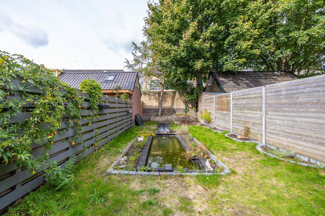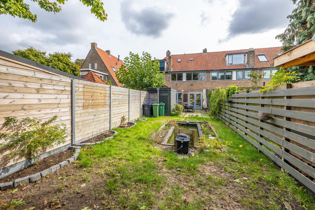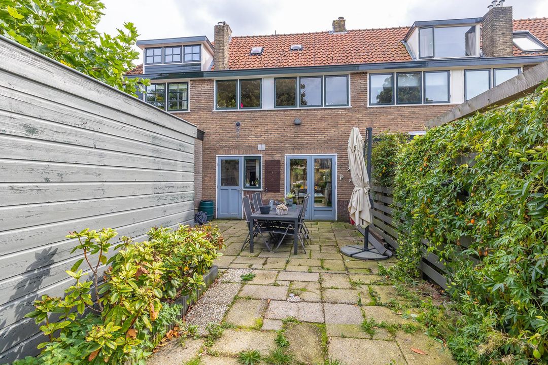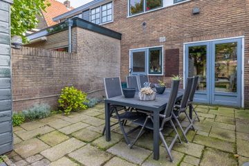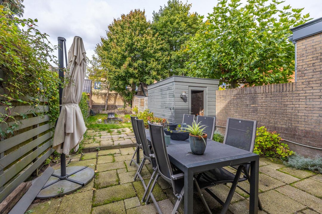 De zonnige ruim 17 meter diepe achtertuin biedt veel privacy, terras, stenen schuur en achterom.