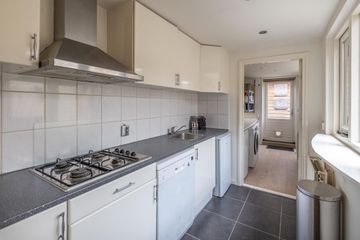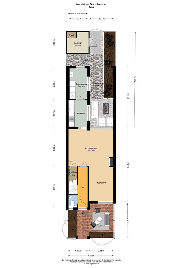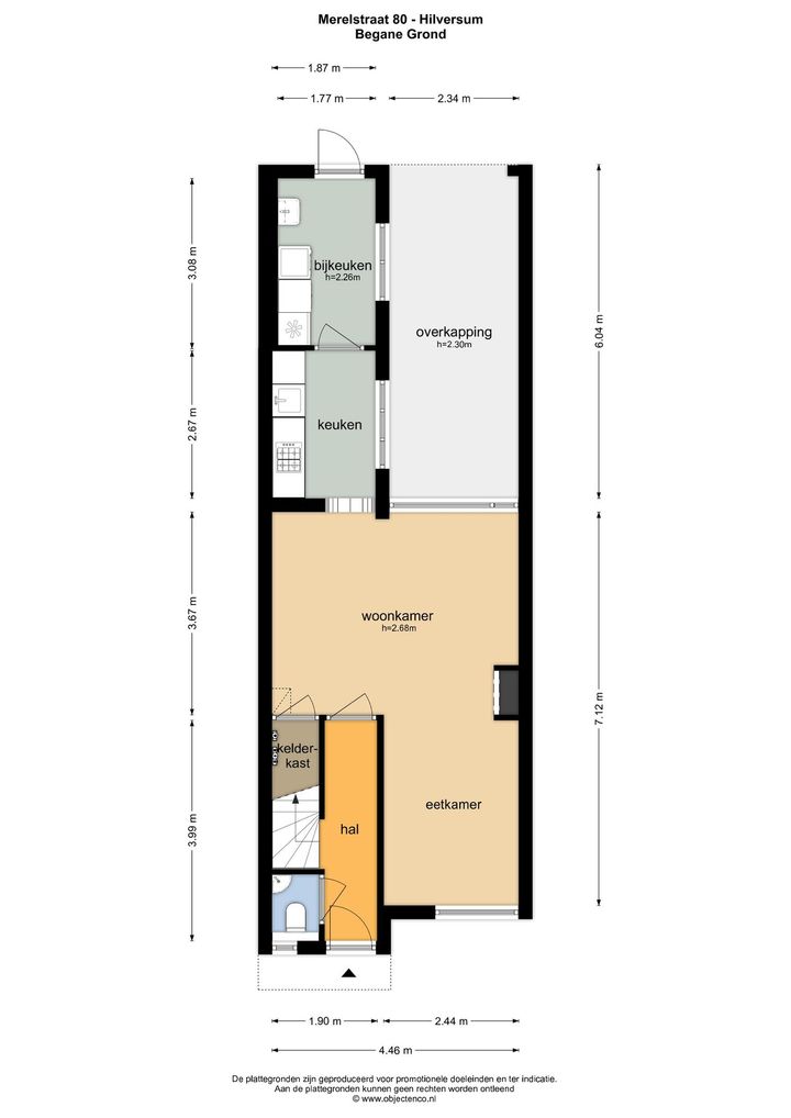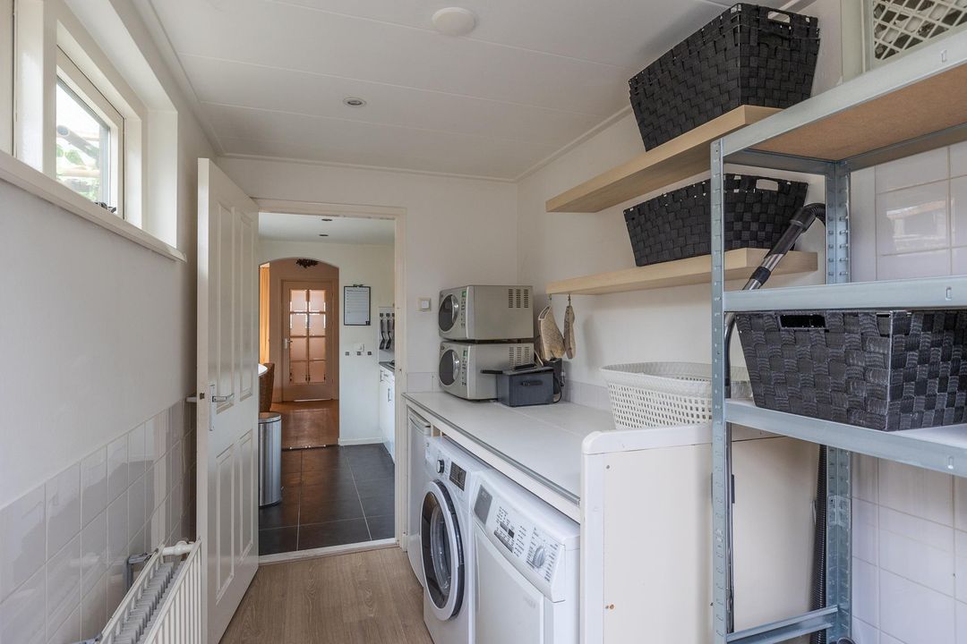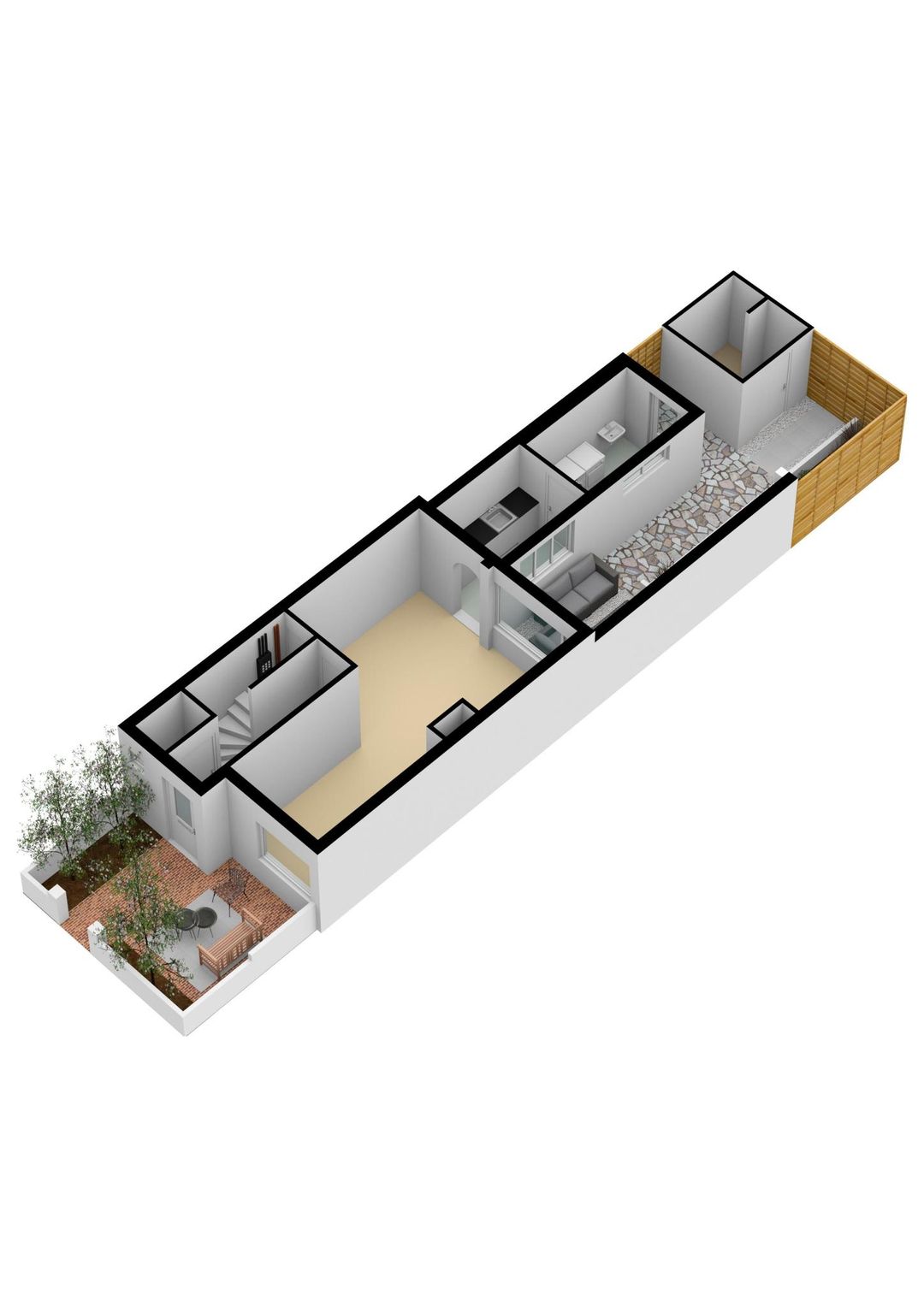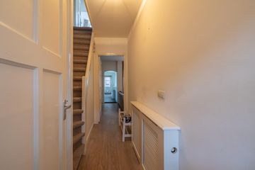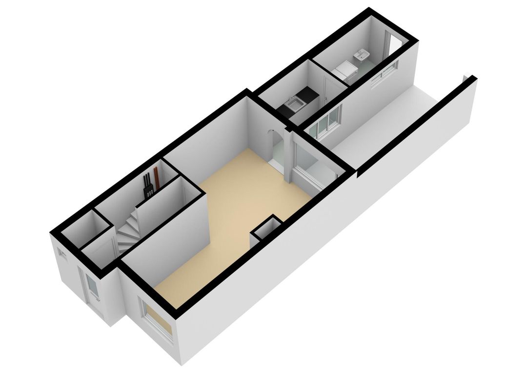 Begane grond: hal, toilet, lichte woon-/eetkamer met een gashaard en een verdiepte provisiekast met meterkast, keuken met direct aangrenzend een ruime bijkeuken (gemakkelijk bij de keuken te betrekken) met wasmachine-aansluiting en een deur naar de achtertuin (zuidwest) met schuur (voorzien van elektra) en achterom.
