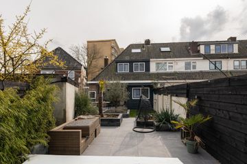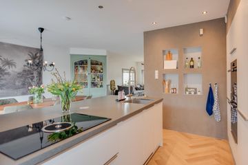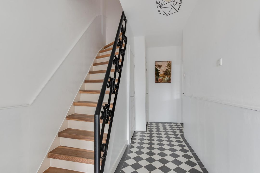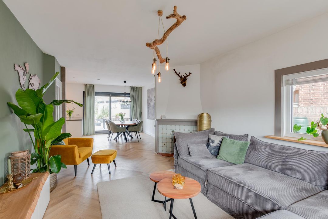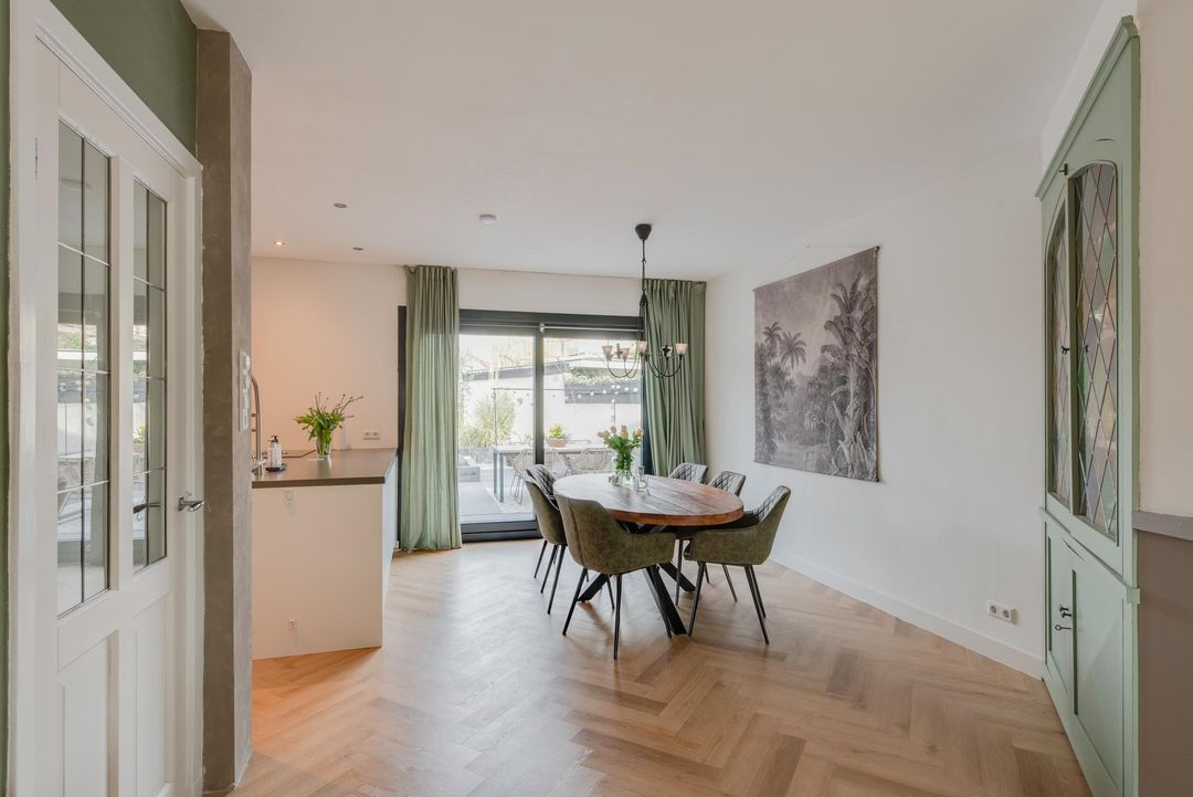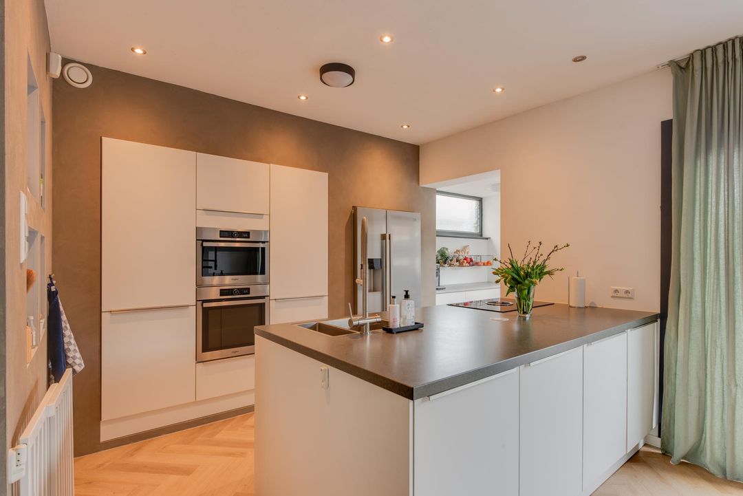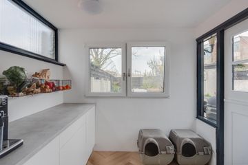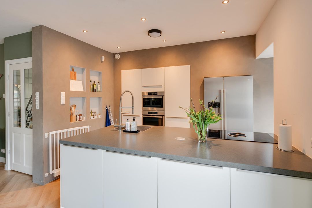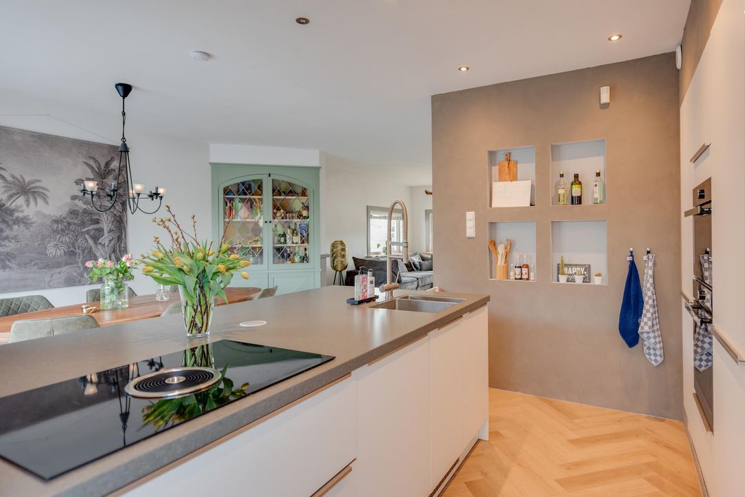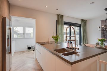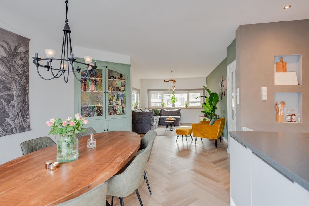 Indeling: entree, vestibule, ruime hal, bergkast met zeer uitgebreide vernieuwde groepenkast, toilet met fontein, gezellige, brede en lichte woon-eetkamer met stroken pvc-vloer met houtmotief in visgraat gelegd en v.v. vloerverwarming, luxe open keuken v.v. inbouwapparatuur, bijkeuken met toegang tot de achtertuin.