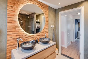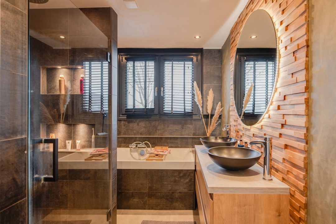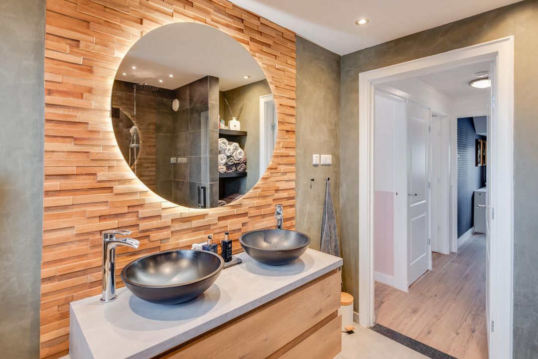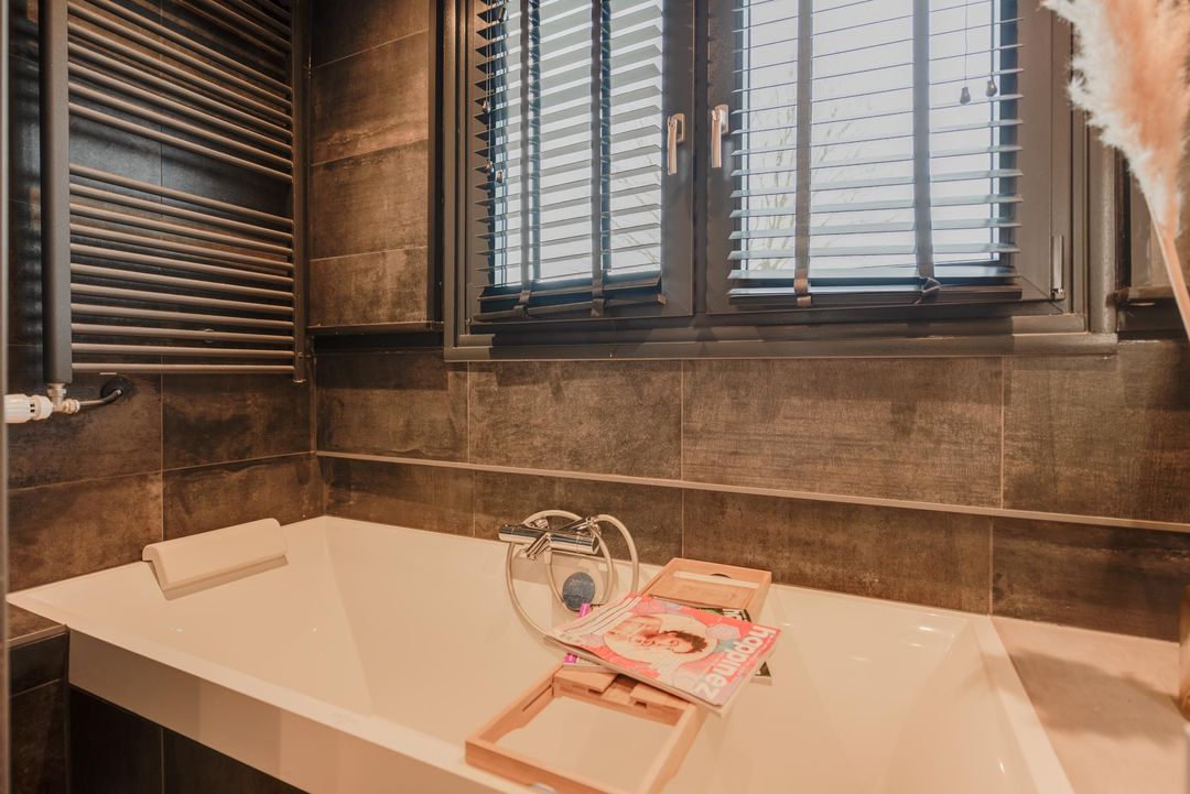 Verdieping: overloop, separaat toilet met fontein en vloerverwarming, prachtige luxe badkamer met wastafelmeubel, ligbad, separate douche en vloerverwarming.