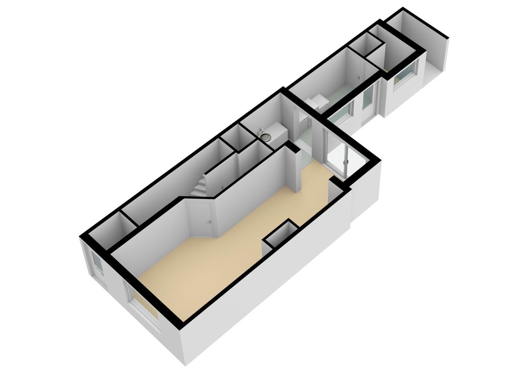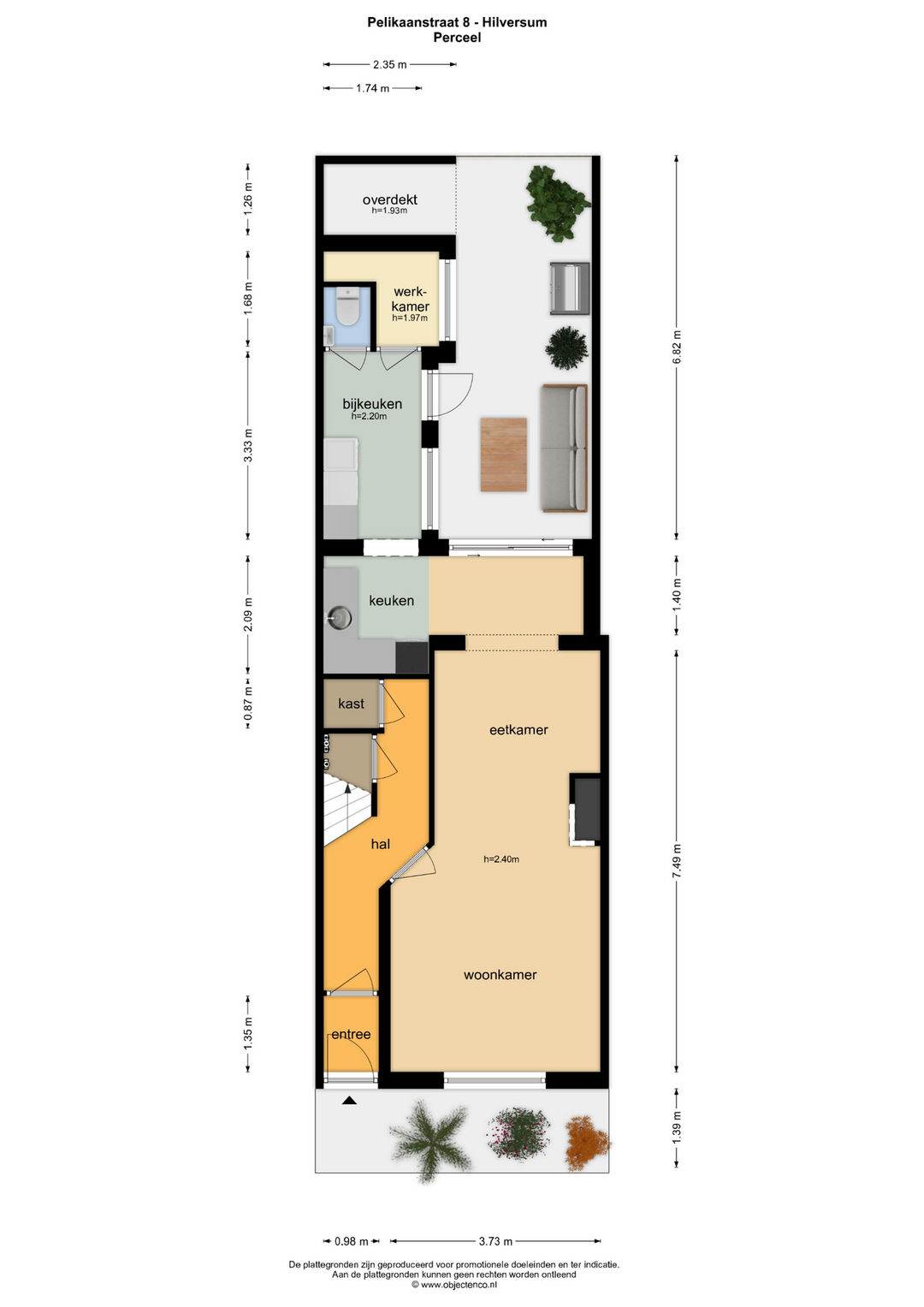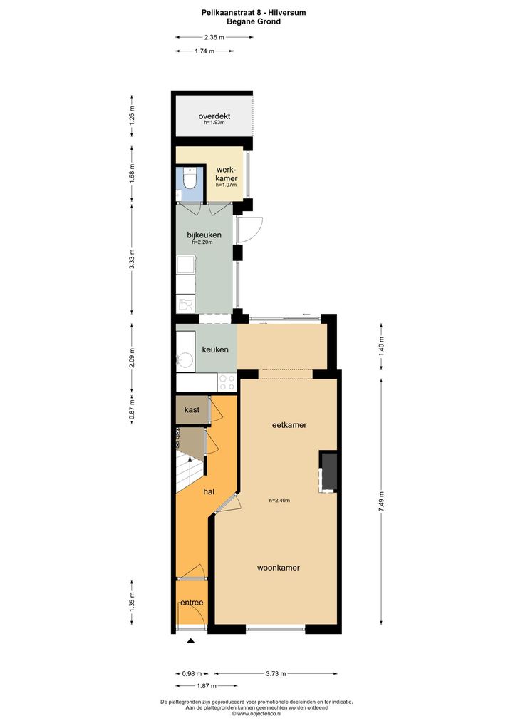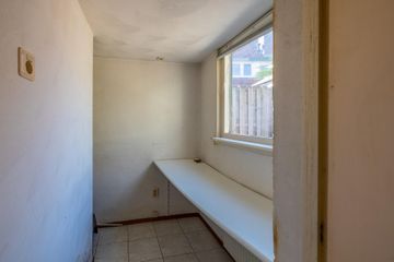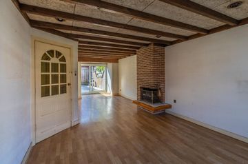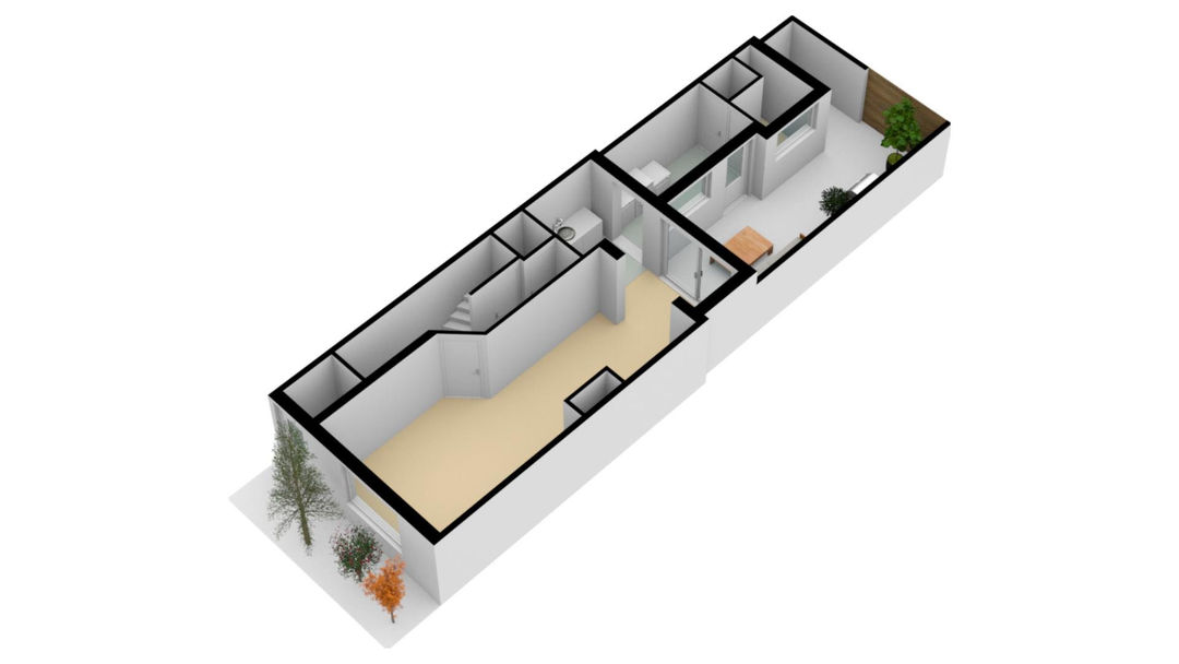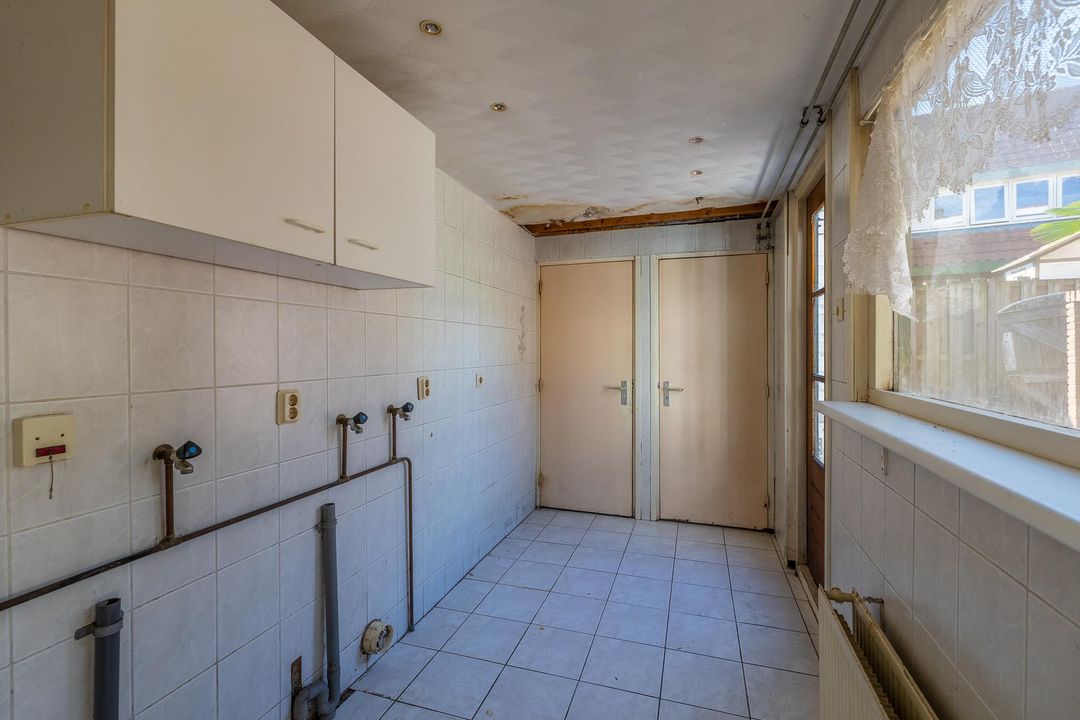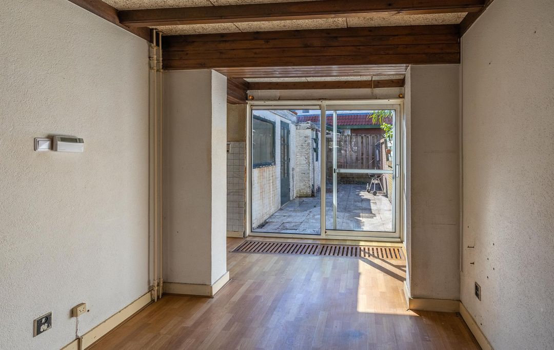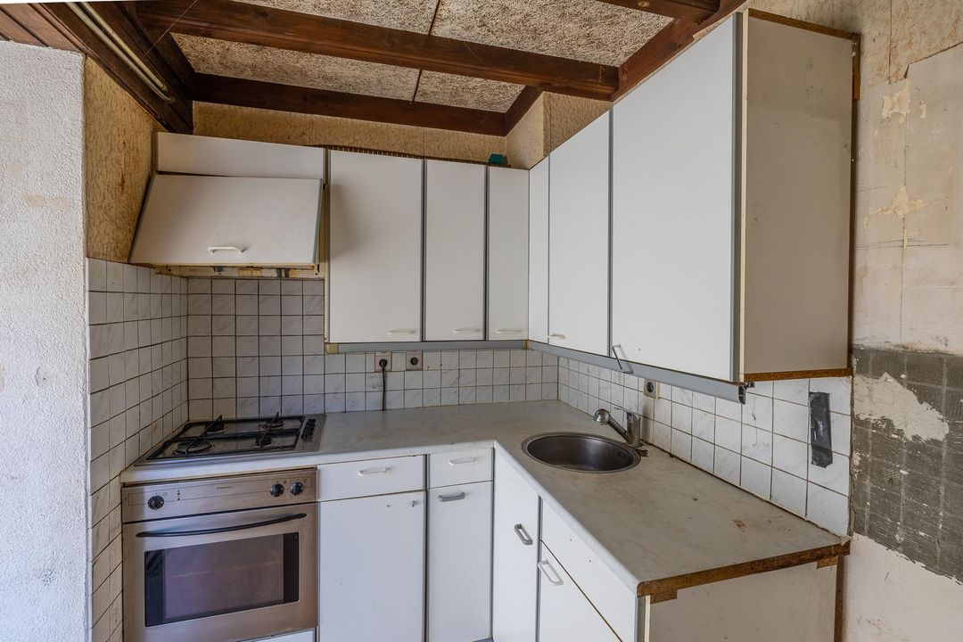 patiotuin met een eigen achterom, eenvoudige halfopen keuken, bijkeuken, hal, toilet.