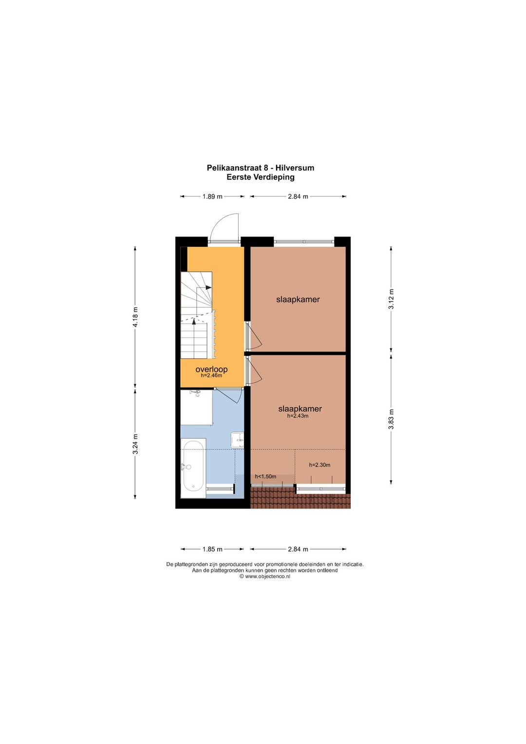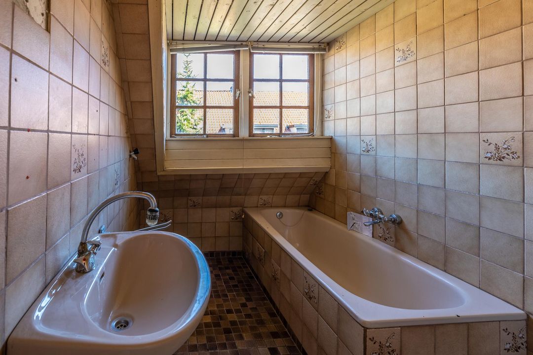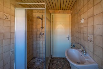 Overloop 1e grote slaapkamer, 2e grote slaapkamer, badkamer met ligbad, douche en een wastafel.