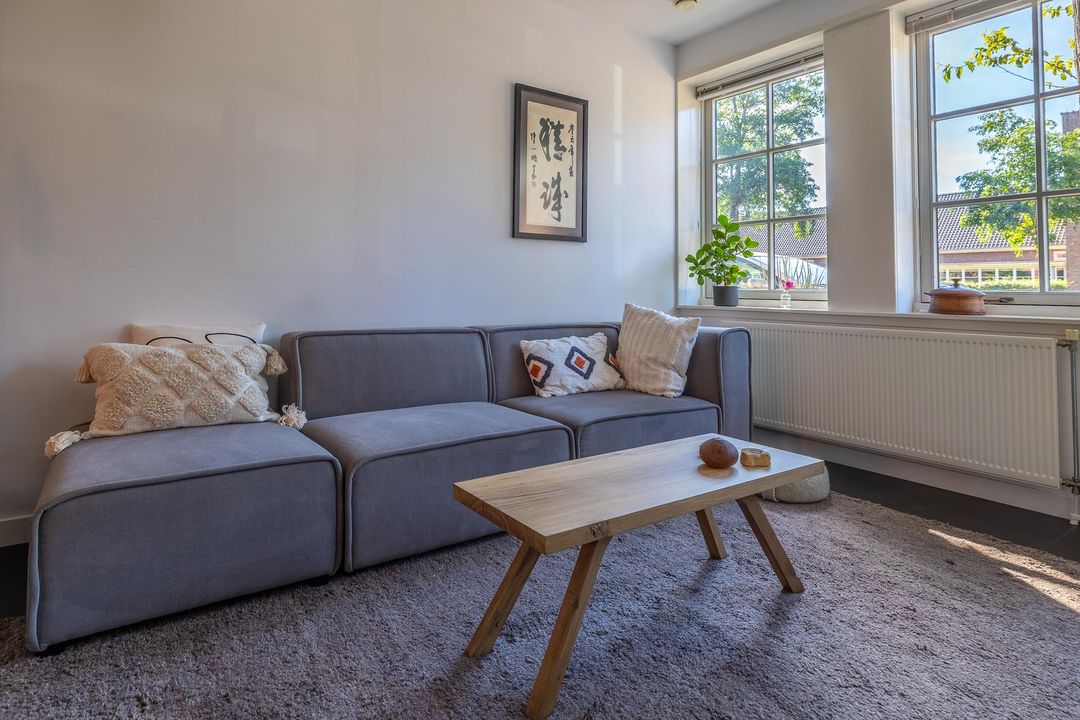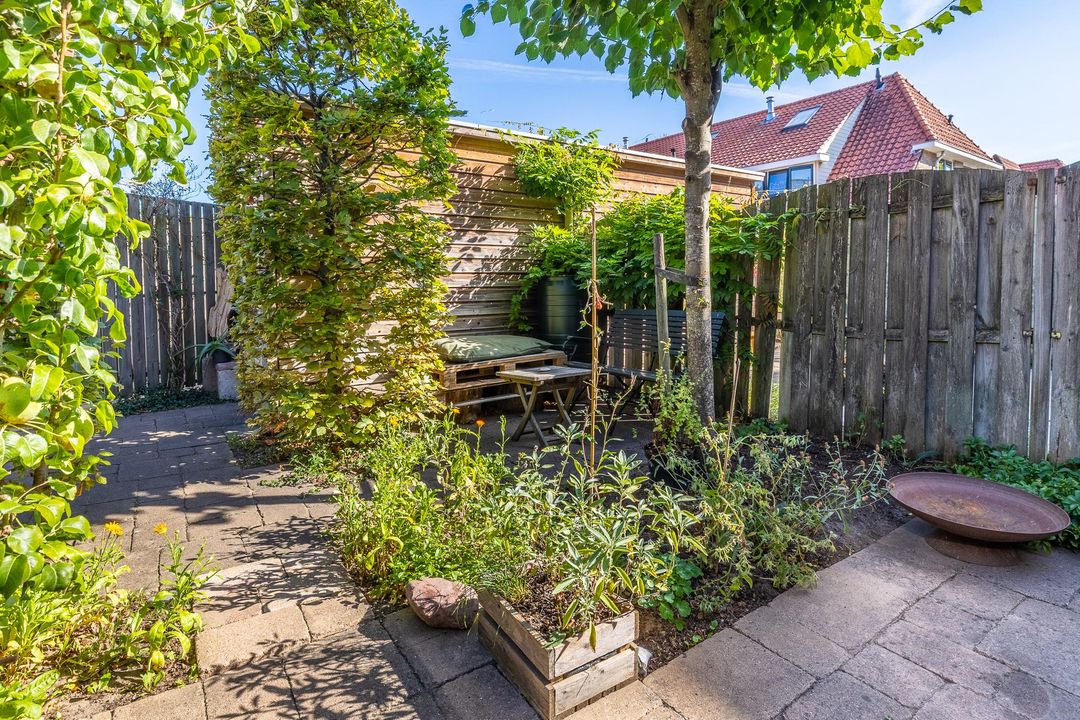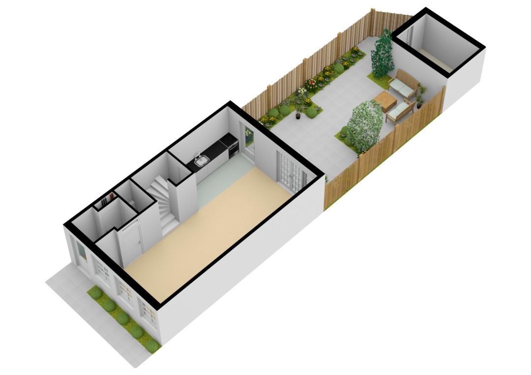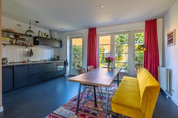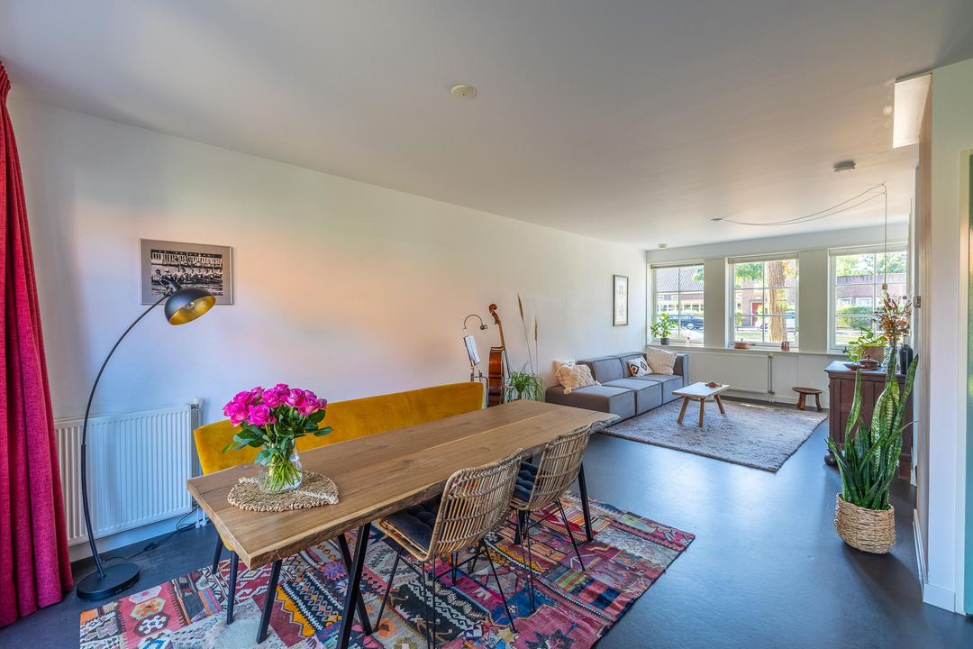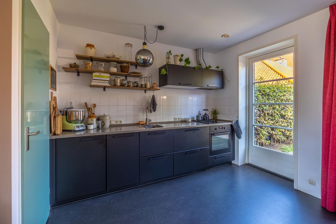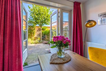 Begane grond: hal, meterkast, toilet met fontein, ruime en lichte woon- / eetkamer met openslaande deuren naar de achtertuin, moderne open keuken met inbouwapparatuur, ruime trapkast en een deur naar de zonnige tuin op het noorden met achterom en vrijstaande houten berging. Gehele begane grond vloer voorzien van marmoleum vloerafwerking en van glad stucwerk op wanden en plafond.