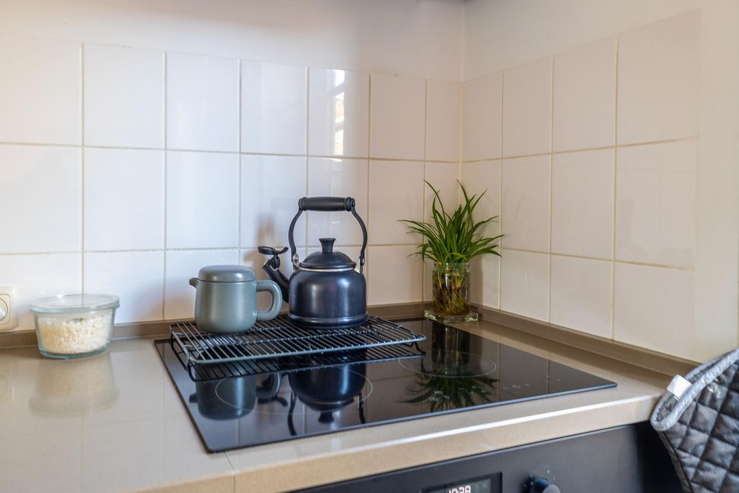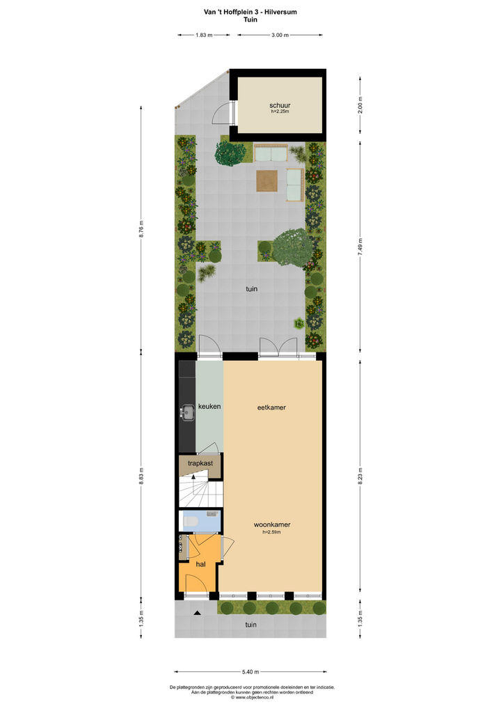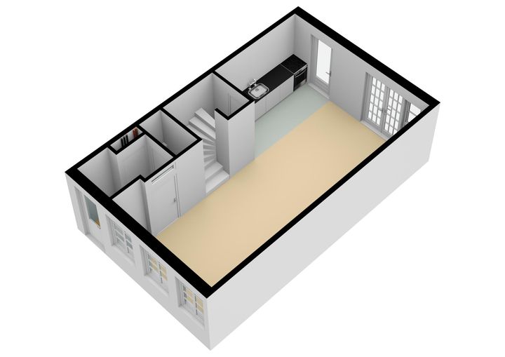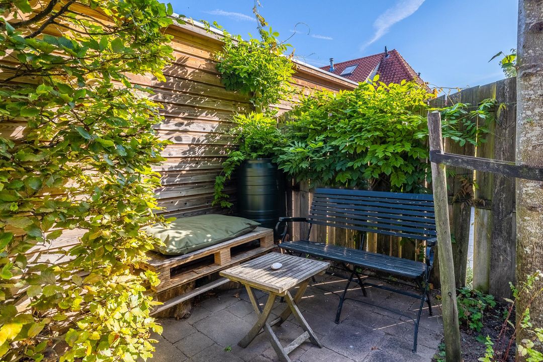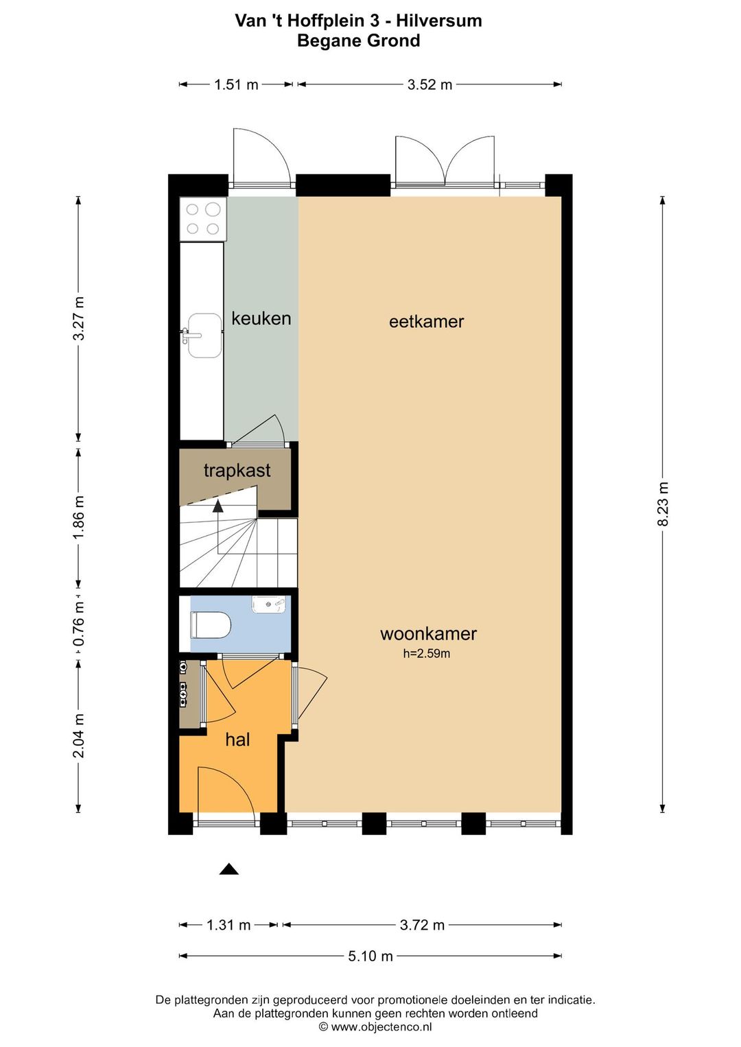 Begane grond: hal, meterkast, toilet met fontein, ruime en lichte woon- / eetkamer met openslaande deuren naar de achtertuin, moderne open keuken met inbouwapparatuur, ruime trapkast en een deur naar de zonnige tuin op het noorden met achterom en vrijstaande houten berging. Gehele begane grond vloer voorzien van marmoleum vloerafwerking en van glad stucwerk op wanden en plafond.